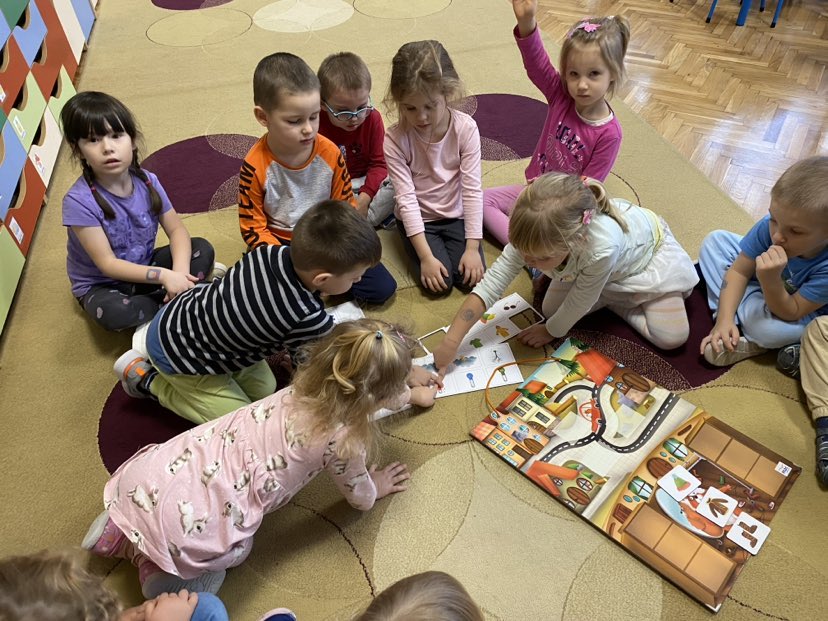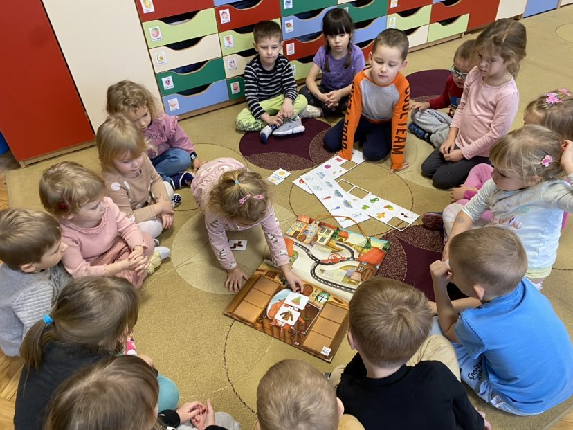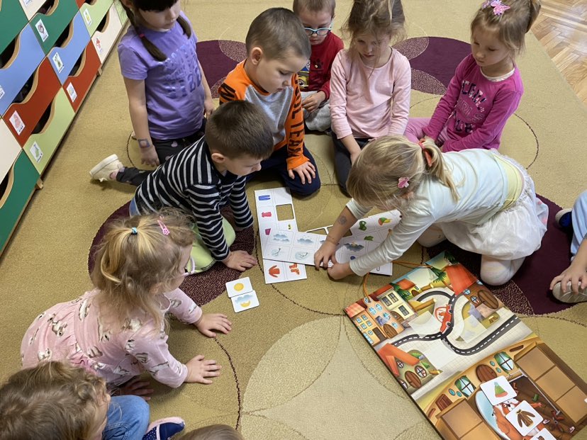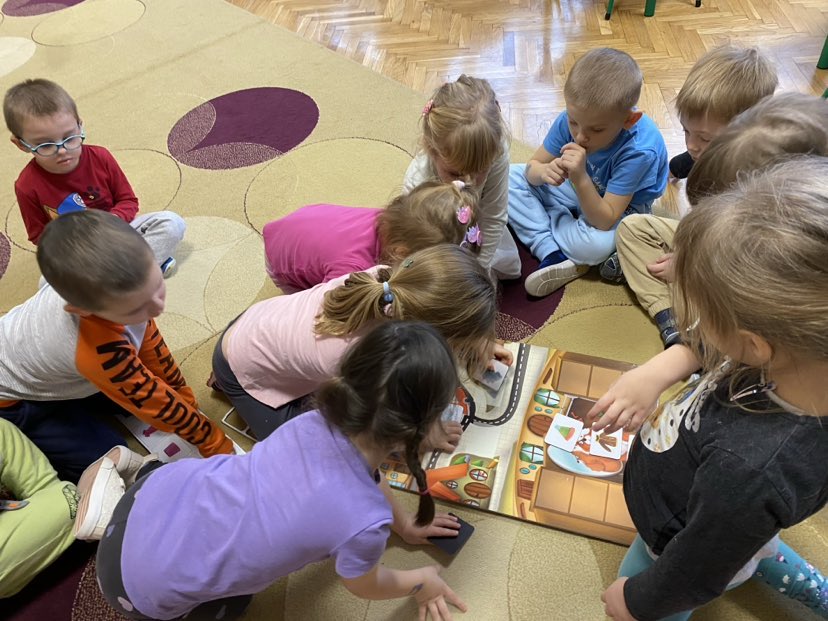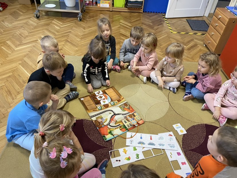 Dziś na tablicy magnetycznej przyczepialismy odpowiednie symbole pogody do aury za oknem. Musieliśmy też dopasować ubrania dla chomika do pogody i pory roku.
