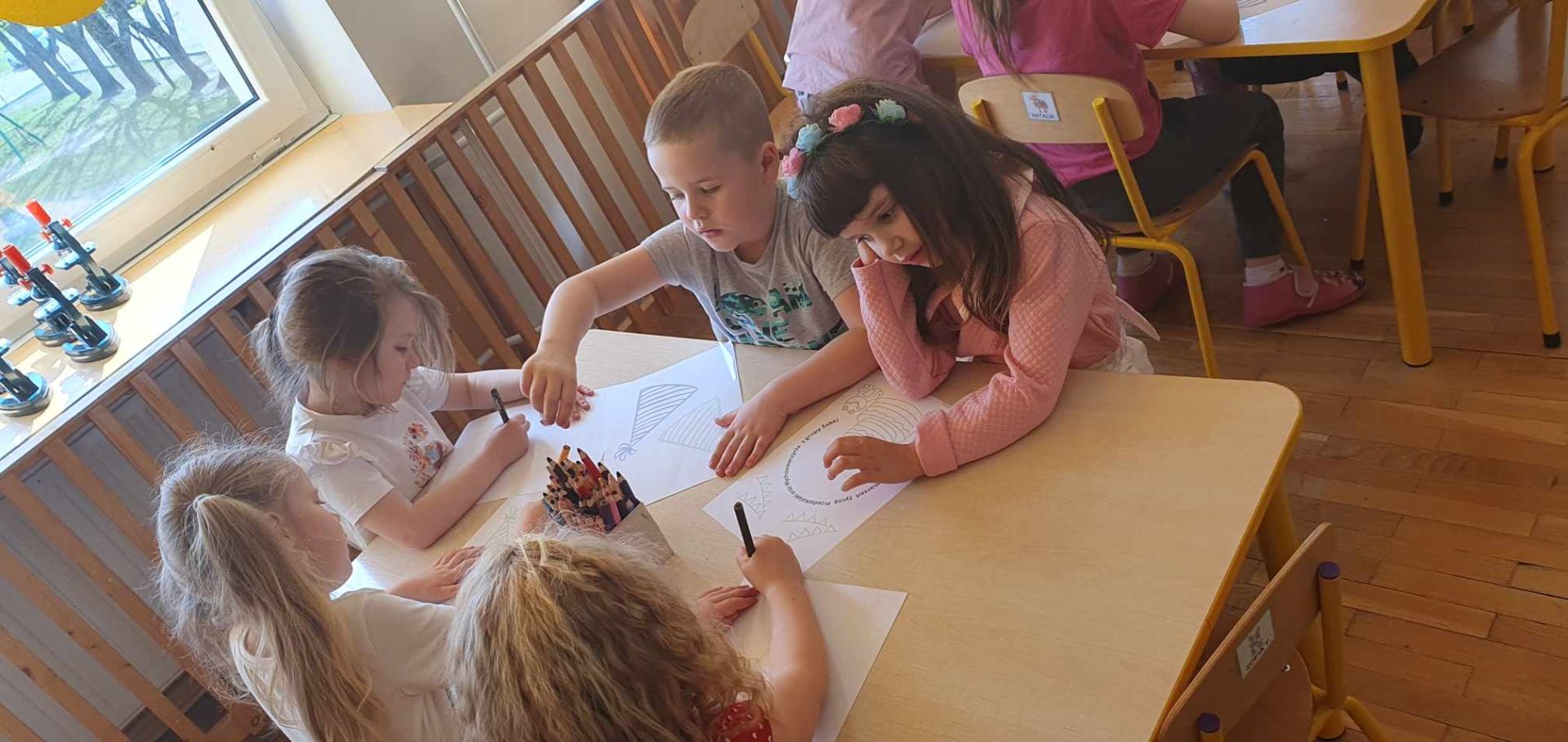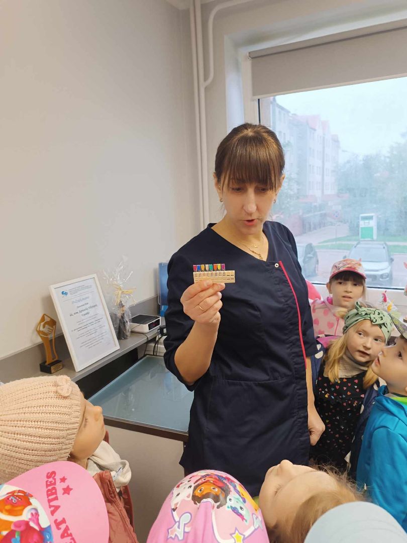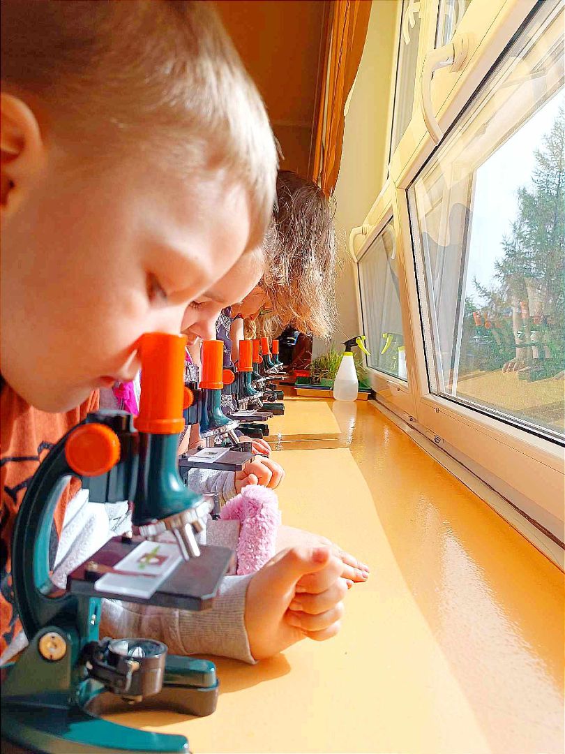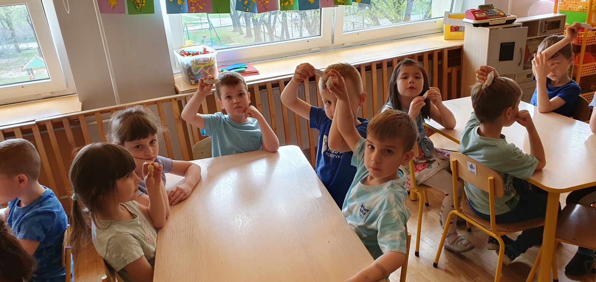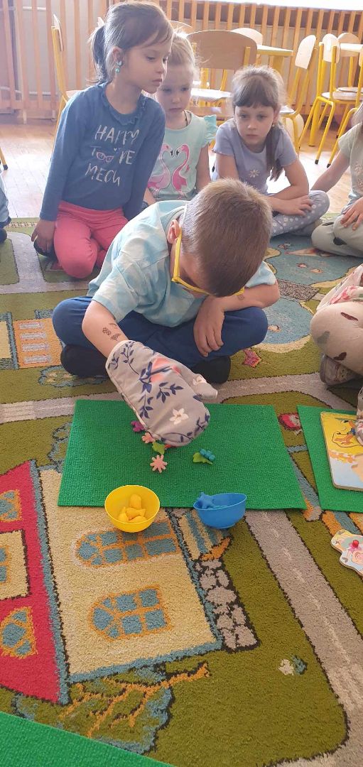 W drugim tygodniu kwietnia rozmawialiśmy o zdrowiu. Dzieci tworzyły mapę pojęciową na temat zdrowia; poznały literę "Z", "z". Bawiły się graficznie przy muzyce; poznały opowiadanie o "Chorobie Karolka" M. Jelonek; pracowały z mikroskopem; poznały jego budową; obserwowały bakterie; ziarenka bazylii; fasolę, czerwoną cebulkę...; rysowały własne bakterie; sadziły warzywa; utrwalały liczebniki główne; rozwijały umiejętność dodawania i odejmowania w zakresie 10. Tańczyły z rekwizytem, wybrały się na wycieczkę do gabinetu stomatologicznego "Baby - dent"... Dodatkowo brały udział w Niebieskich Igrzyskach; świętowały urodziny Tiany; Dzień Czekolady; brały udział w akcji fundacji ajakbox...