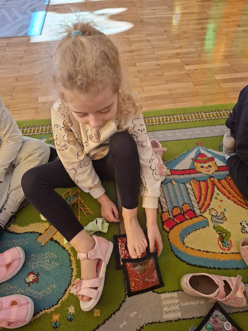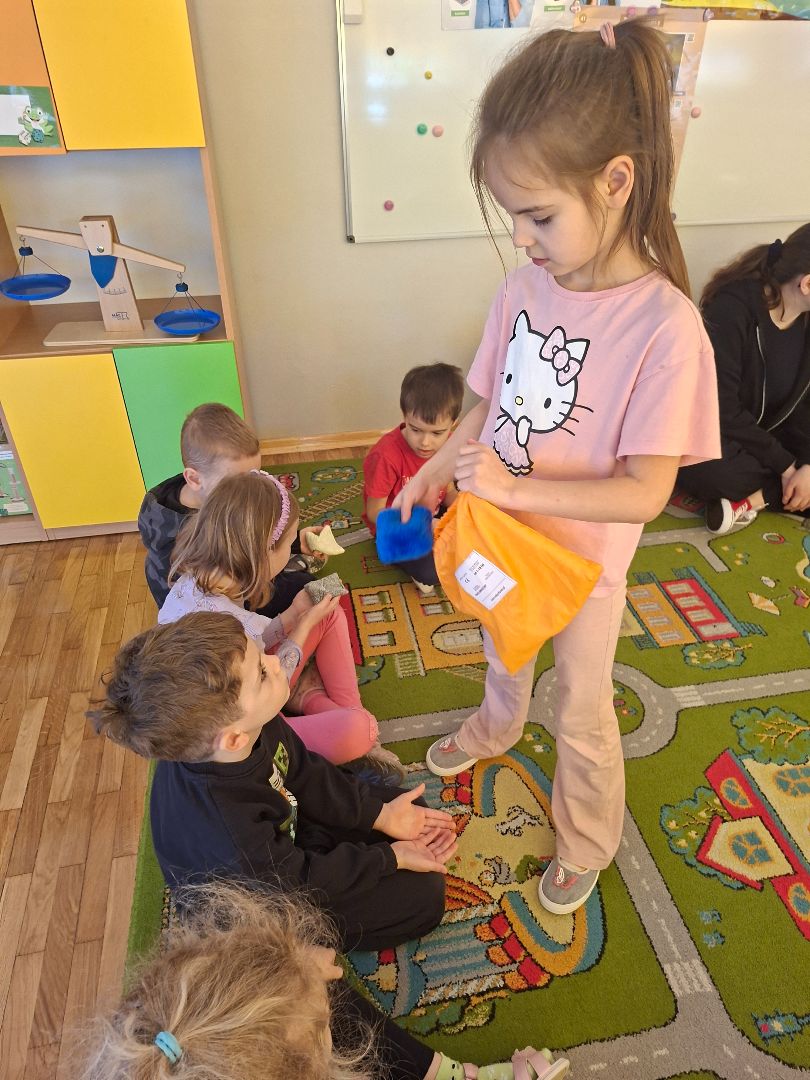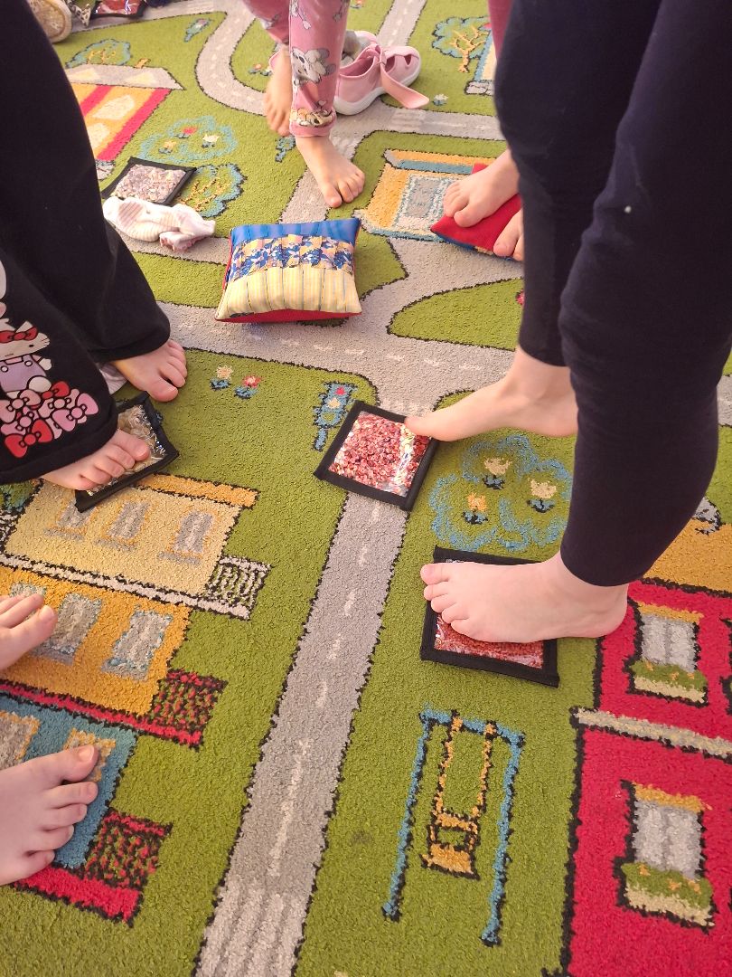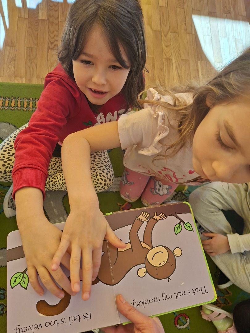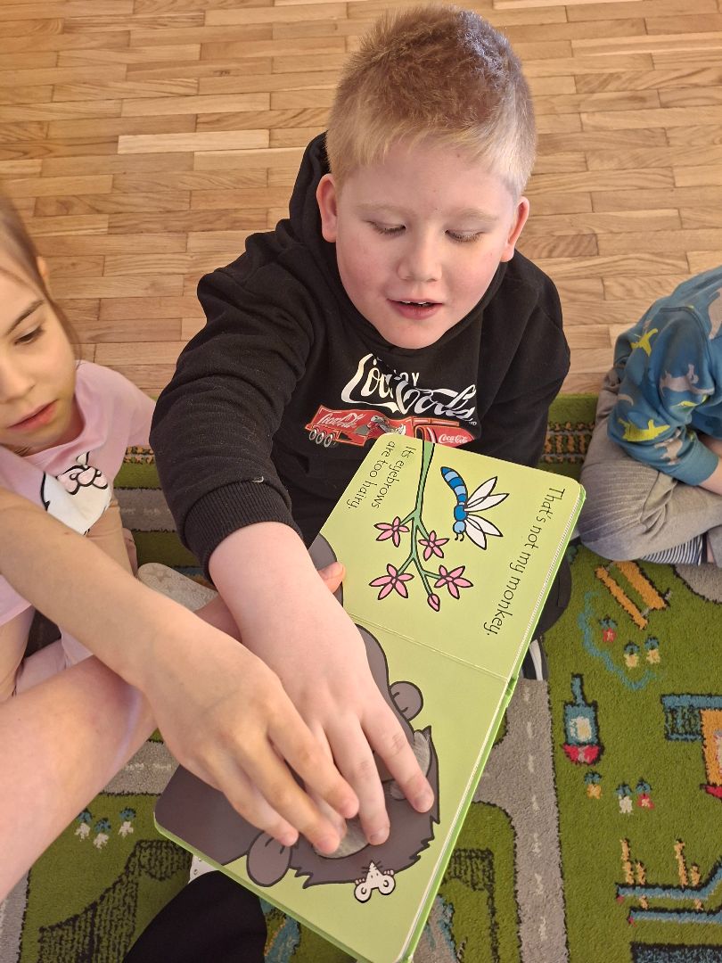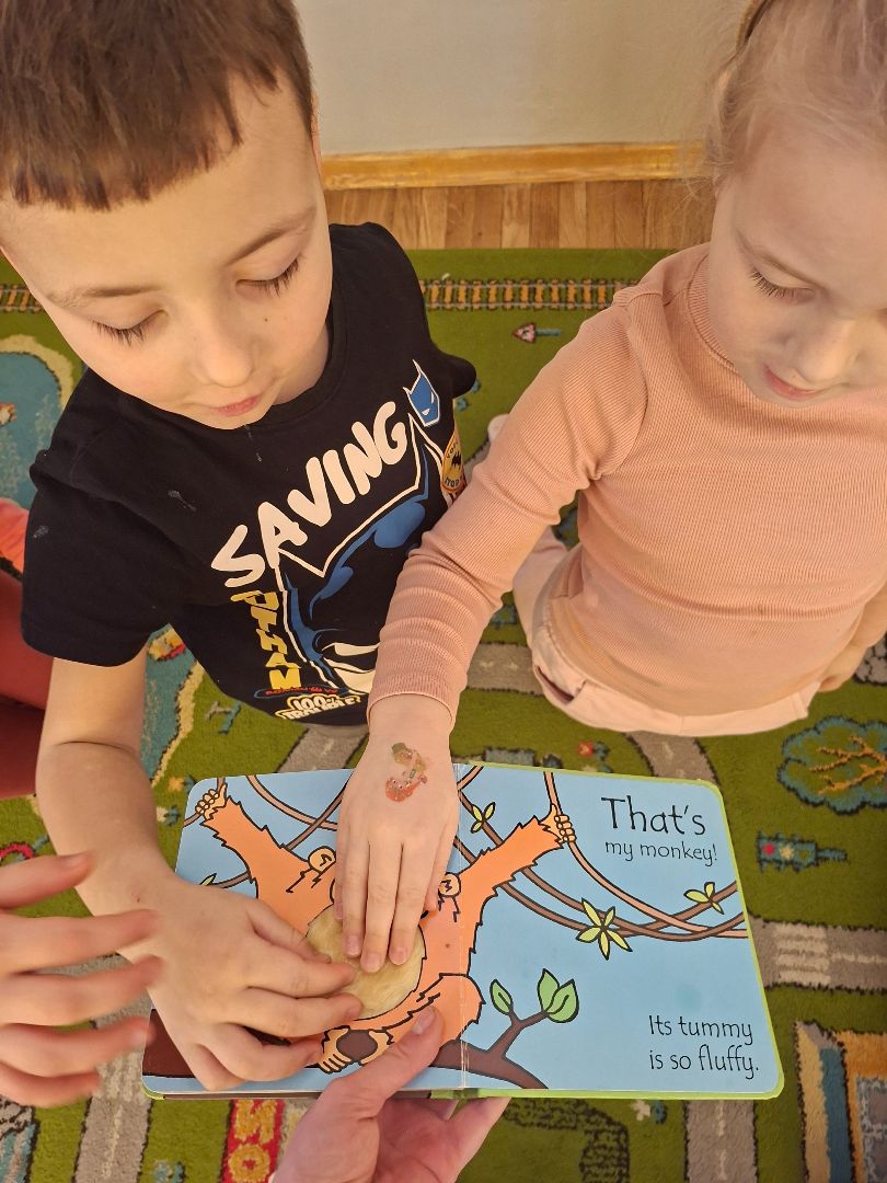 Przy okazji rozmowy o naszych zmysłach, zrealizowaliśmy zadanie projektowe pt. Books and Play. Przeczytaliśmy sensoryczne książeczki w języku angielskim, następnie przeszliśmy do rozwijania naszego zmysłu dotyku dzięki pomocom dydaktycznym od "Małych jeżyków", darom froebla...